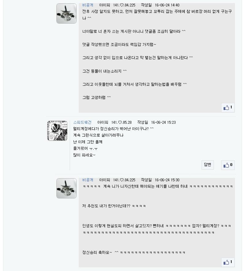 저 멀티.아이디주장하신것 중에.제가 올린글 (지금은 삭제) 을 반대를 누른 아이디가 3개나 보이는군요 ㅎㅎ
