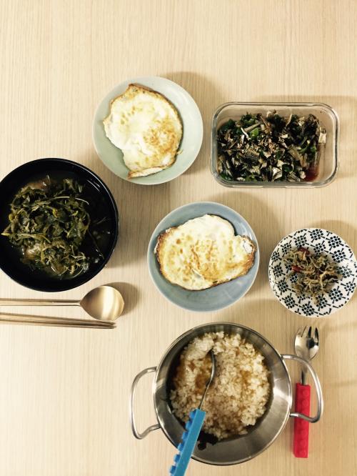 냉이국에 각자 달걀후라이 하나씩, 아이는 안매운 멸치, 전 청양고추 엄청넣은 고추장물이 반찬이예요 ㅎ