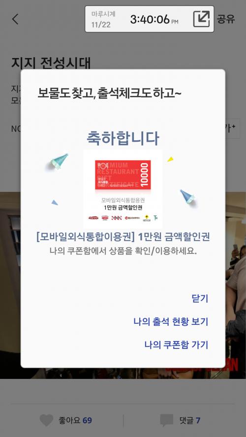 축하드려요~ 부디 남은 기간 몽땅 외식할인권 당첨되시길 ㅠ ㅠ | ||
