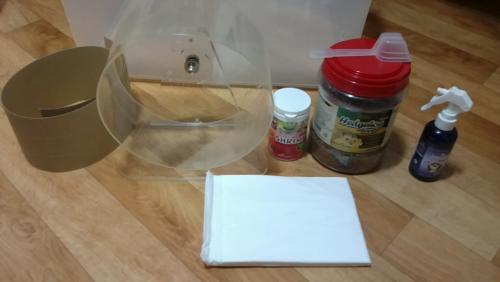 집은 리빙박스에...쳇바퀴...밀웜..사료..가시에 뿌리는 스프레이..배편패드 정도 입니다