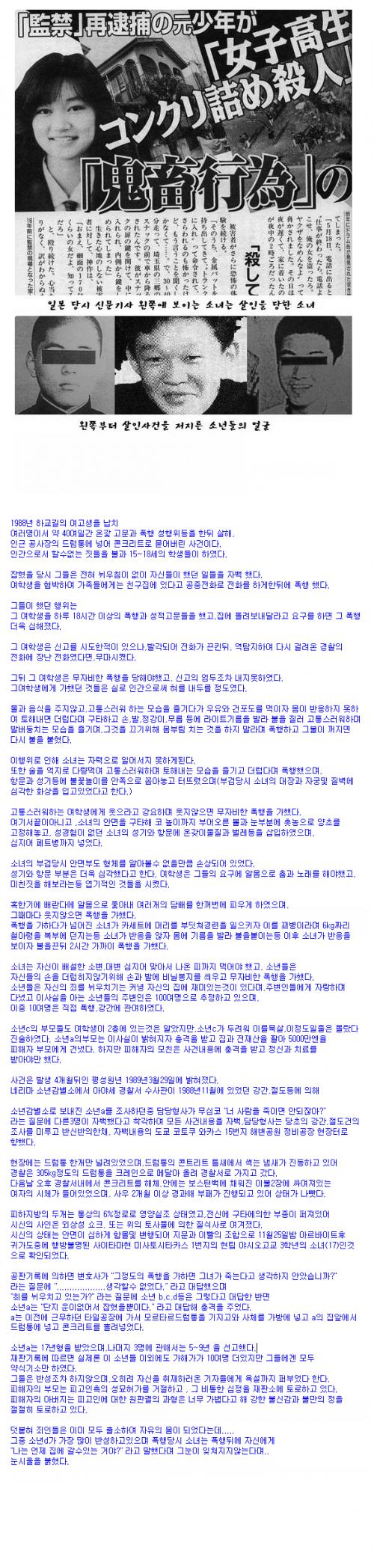 처음 접했을때 정말 구역질 나더군요.... 지금도 제목만 보고 스킵.... 더 쓰레기 같은건 일본에서는 저게 만화로 나오고 AV로 나온다는군요?? 엽기적인 곳입니다 정말... // 우리나라 밀양 사건 가해자도 경찰되서 승진하고 잘 먹고 잘살고 있다고....... | ||