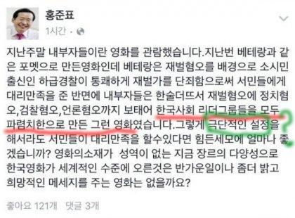영화를 영화로만 못받아들이는건 도둑이 제발 저리는것과 같은 증세라고 봅니다. 한동안 내부자들 본 외국친구들이 마치 한국 사회에 만연해있는 현상이냐라고 해서 영화는 영화일뿐이라고 강한 부정했건만, 정정 해야할듯 싶네요. | ||