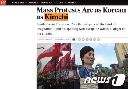 8. ‘김치만큼이나 한국적인 대규모 집회’... → 미국 정치외교 전문지 ‘포린폴리시’(FP)의 한국 촛불 집회 기사 제목▼. 英 ‘이코노미스트’는 ‘하야해야 한다’고 보도.(세계 외)