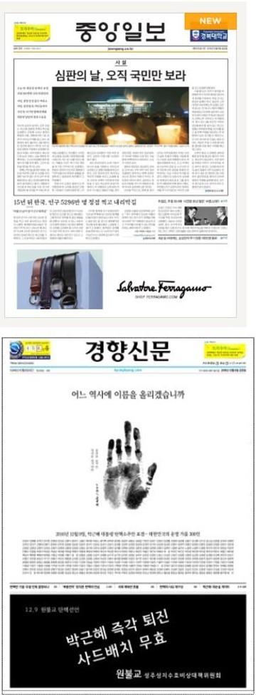 2. ‘어느 역사에 이름을 올리겠습니까’, ‘심판의 날 오직 국민만 보라’ → 경향은 1면 전면에 안중근 의사의 ‘손바닥 도장’... 중앙은 사설을 1면에 배치. 신문들 탄핵투표 1면 기사(▼)(경향, 중앙 외)
