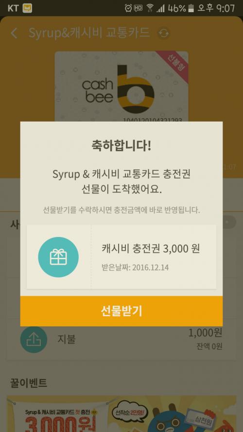 시럽x 캐시비 ㅡ 5천 충전하면 3천원 지급..