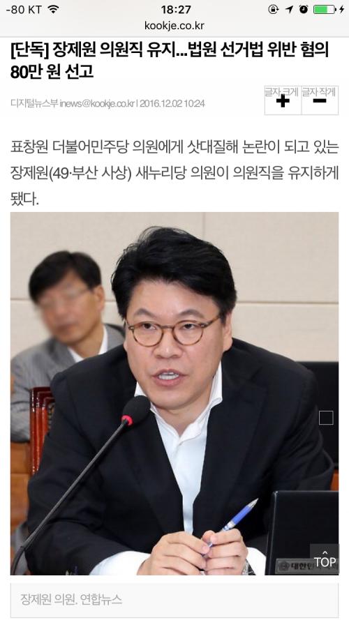 아, 그리고 벌금80만원ㅋㅋㅋㅋ진선미의원은 선거구도 확정되기 전에 진행한 행사때문에 700만원인데 장제원이 저거는 선거구확정나고 불법으로 사전선거운동했는데도 벌금차이가 열배가까이 난다는 사실