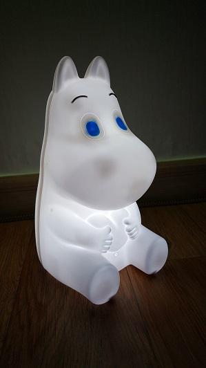 좌-케익에서 추출(?)한 무민 인형을 머리 위에 올려둔 모습 / 우 - 어둡게 한 상태에서 전원 켠 모습