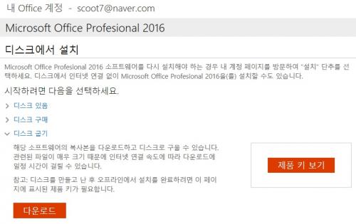 저기서 받은 키로 마소계정 새로파서 오피스 설치가 가능하네요.