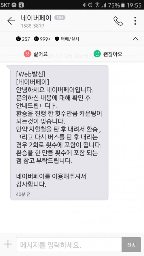 버스 버스 버스 버스 이렇게 탔을때 횟수가 몇번인지 확인차 문의했더니 사진처럼 문자답이 왔네요..그냥 갈아탄 버스를 횟수라 생각하면되는건지...잘 이해가 안가네요..