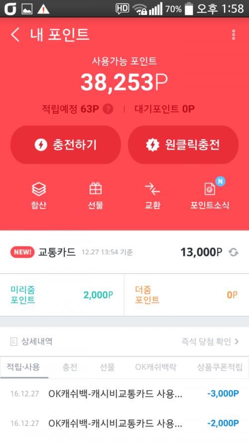 이게 제가 최초발급으로 오케이캐쉬백 교통카드를 발급받아 알아서 미리줌 3000포인트를 줬더라구요 (이벤트개념) 그래서 그게 먼저 소진됐어요 저는 그 후에 또 다시 5천을 충전해서 미리줌 2000포인트를 소진했습니다 | ||