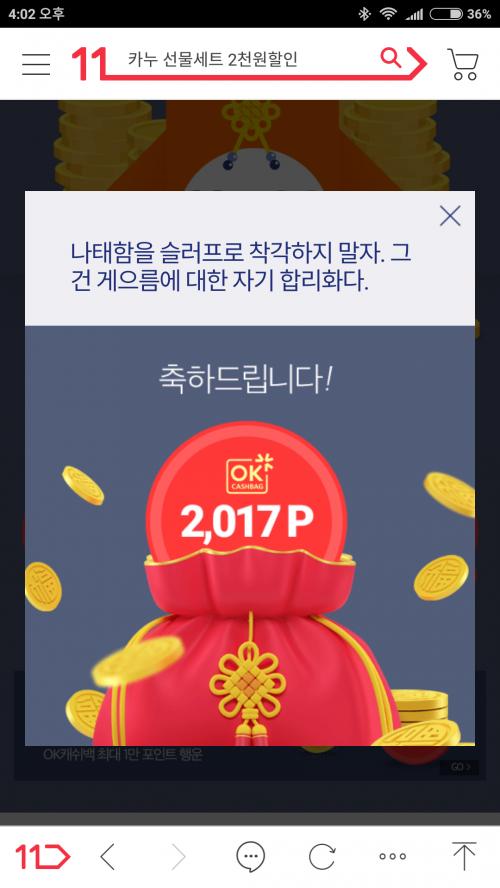 메인화면에 매일매일 쿠폰주는데 밑으로 내리시면 복 주머니 있습니다.