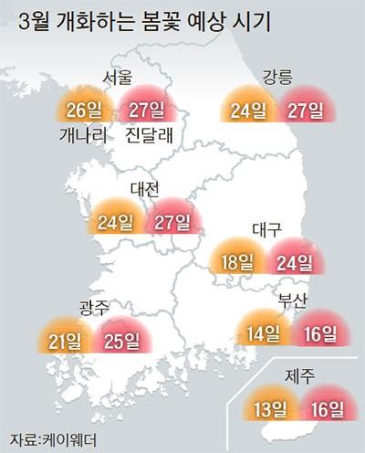 7. ‘개나리’ 3월 14일, ‘진달래’ 3월 16일(남부 기준) → 올해 봄기온 높아 평년보다 3~4일 봄 꽃 일찍 필 듯. 케이웨더.(중앙)▼