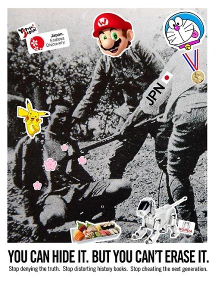 포스터 형태인 이 광고는 일본의 잔혹한 침략사가 담긴 흑백사진 위에 헬로키티, 마리오, 피카추 등 오늘날 일본을 대표하는 캐릭터를 스티커로 덕지덕지 붙였다.