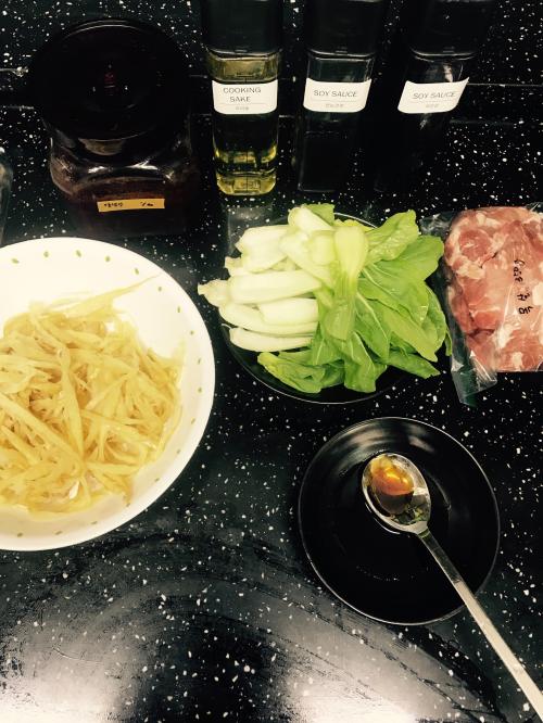 감자볶음만 먹기 심심할땐 돼지고기를 얇게썰어 찹쌀가루 뭍혀 살짝 데쳐서 간장양념으로 같이 볶아내요.
