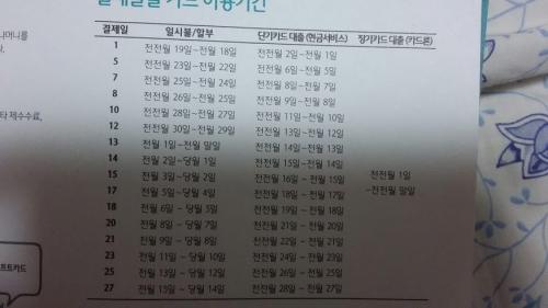 카드마다 다른데요 대부분 이런식이에요. 결제일 정할때 저표 찾아서 1일- 말일이 실적기간인 결제일로 지정하는게 조아요. | ||