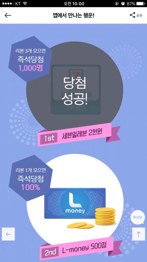 59분 59초에 출첵 옆 럭키박스 눌르고 럭키박스 신청하기 눌렀는데 반응이 없어서 연속 3번 눌렀더니 2등...순삭이네요.. | ||