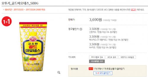 오뚜기 500g 1+1 사왔습니다. 매대에 있는 종이 쿠폰도 적용가능합니다. (개당 300원)
