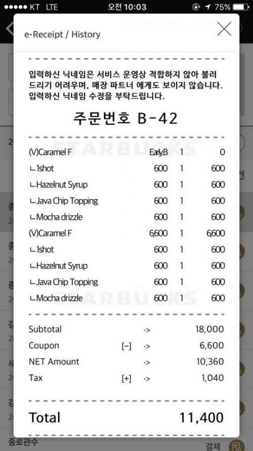 영수증이 안보이는데 유료로 추가되는 엑스트라는 두잔다 적용된다고 답변받았었어요..
