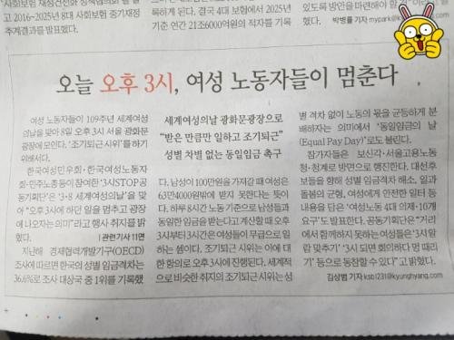 해보는 것도 나쁘지 않아 보입니다. 여자가 느끼는 차별, 남자가 느끼는 역차별 이런 것들이 조금씩 해소되어 가야 남녀차별이 사라지겠지요. 그런데 윗분들 말씀처럼 같은 년차 같은 직급 같은 업무를 하면서 급여차이가 나는지는 확인하고 볼일이네요. | ||