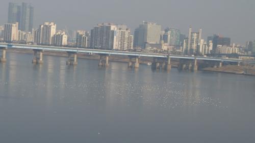 강물에 무슨 새인지는 몰라도 무리를 지어 모여있네요..