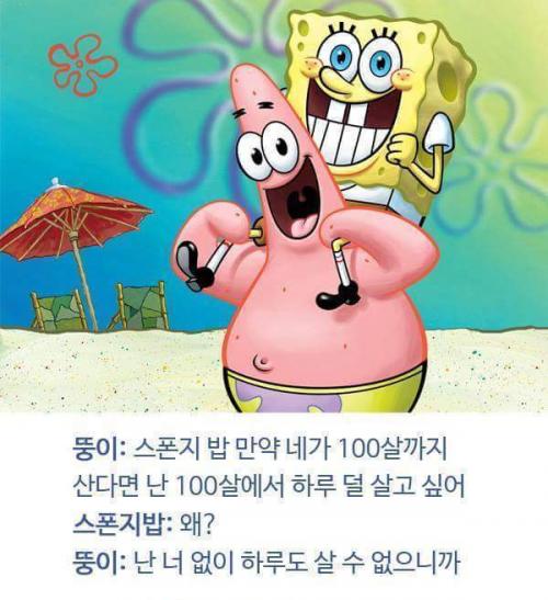 스펀지밥한테만 의리넘치는 친구네요 ㅋㅋ 전 볼때마다 징징이가 불쌍하던데... ㅜㅜ | ||