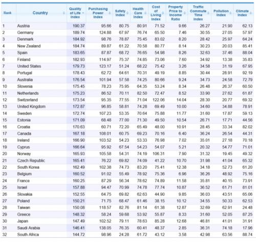 각 국가의 삶의 질을 평가하는 항목으로는, 구매력, 오염, 소득대비 주거비, 생활비, 안전, 의료서비스, 교통체증, 기후 가 고려 항목이었다.