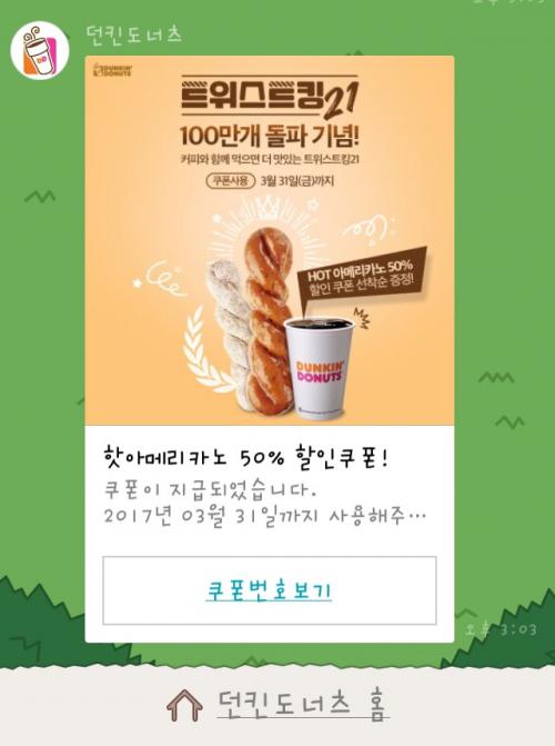 카톡 플친 던킨도너츠 아메 50% 쿠폰 (선착순) > 자유게시판