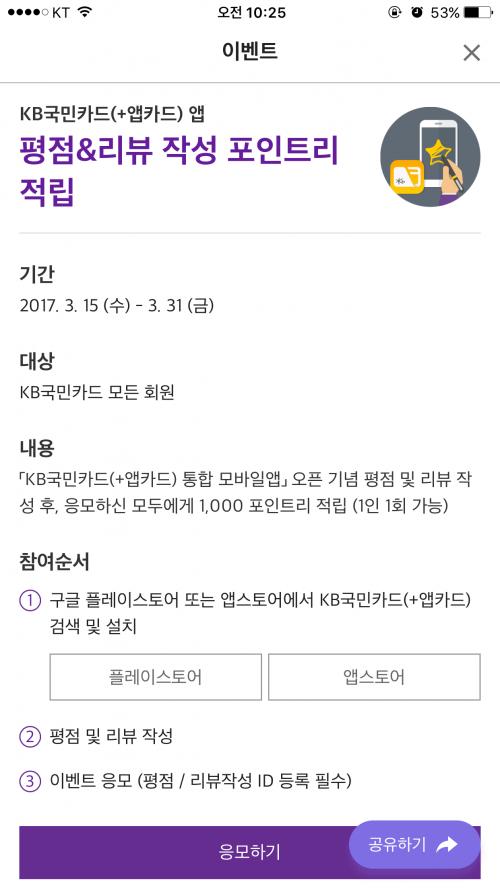 제 아이폰 경우로는 앱스토어에서 어플 리뷰 작성하고 작성한 아이디를 국민카드(앱카드) 통합 어플 이벤트 들어가서 아이디 입력하면 응모 완료 되는걸로 보여요. | ||