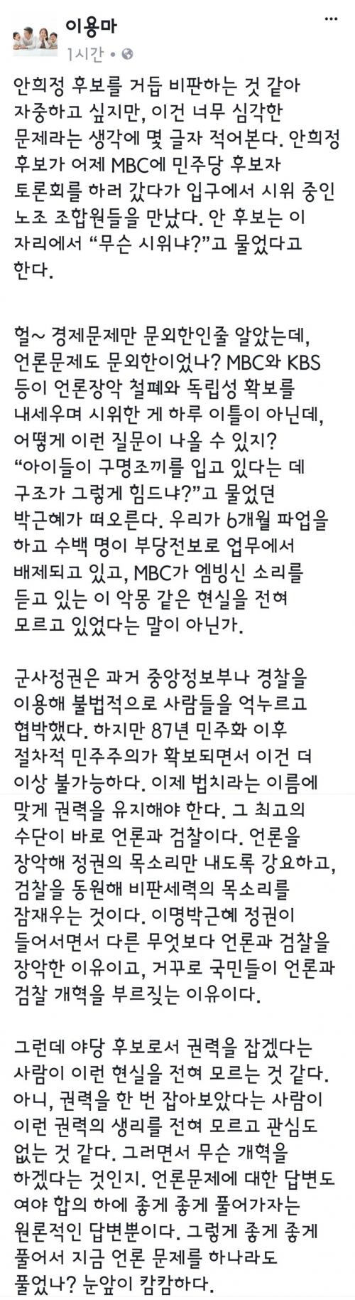 MBC 노조 파업을 이끌다 해고당한 이용마 기자가 페북에 쓴 글인데...