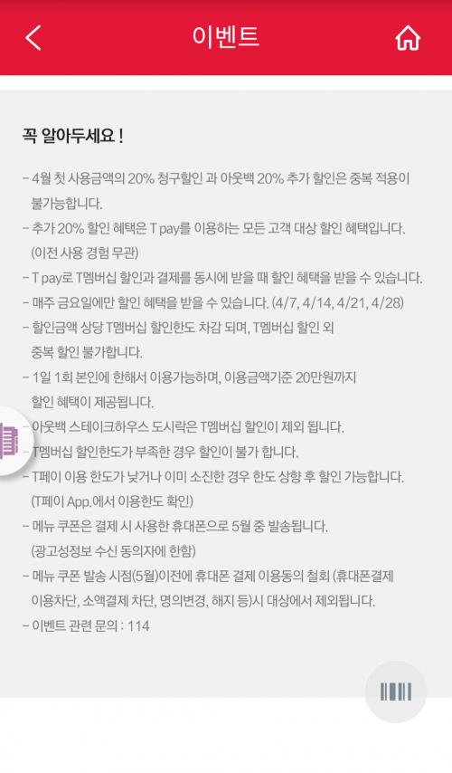 T페이 4월 첫구매 20%청구할인 중복도 안된다니 이름뿐인 이벤트인 것 같습니다.