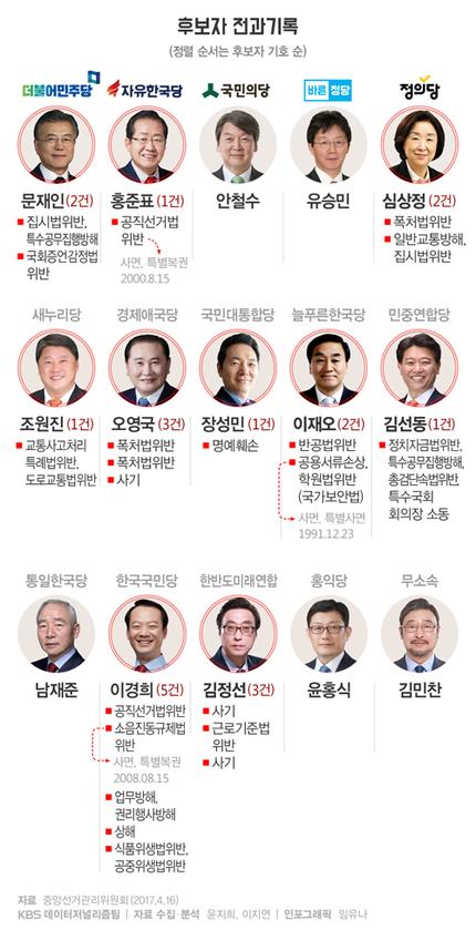 안철수, 유승민 후보와 남재준, 윤홍식, 김민찬 후보는 전과가 없습니다. 다른 후보들의 전과는 죄의 종류와 죄질이 다릅니다.