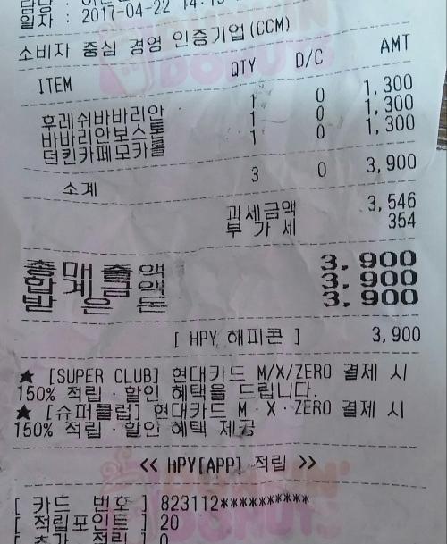 도넛은 1300원짜리 세개 딱 바꿔왔습니다.