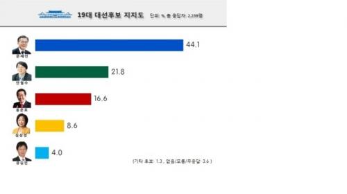 30일 리얼미터가 전국 19세 이상 유권자 2239명 대상으로 실시한 여론조사(1만8941명 통화 시도ㆍ응답률 11.8%ㆍ표본오차 95%ㆍ신뢰수준 ±2.1%pㆍ자세한 사항 중앙선거여론조사심의위원회 홈페이지 참조)에 따르면 문재인 더불어민주당 후보가 44.1%의 지지율로, 21.8%를 기록한 2위 안철수 국민의당 후보를 더블스코어(22.3%p) 차이로 앞섰다. 홍준표 자유한국당 후보는 16.6%를 기록했다. TKㆍ강원, 60대 이상, 보수층에서 1위로 올라서 선거막판 보수 성향 지지자들의 집결을 예측케 했다. 4위는 심상정 정의당 후보 8.6%, 5위 유승민 바른정당 후보 5.6% 순이었다.