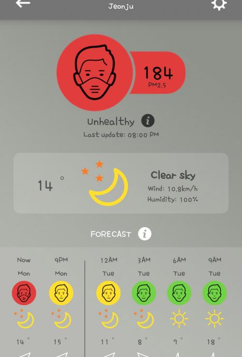 낮부터 바람방향이 바뀌어서 살짝 좋아졌었습니다 대략 60-70수준까지 떨어졌는데, 다시 밤부터 방향이 바뀌었는지 어마어마하게 안좋아졌네요... | ||