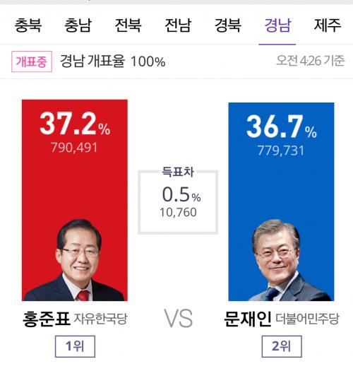 경남은 창원 양산 김해 거제 같은 공업지역은 문재인이 이겼고 그 외지역이 홍준표가 이겼더라구요 | ||