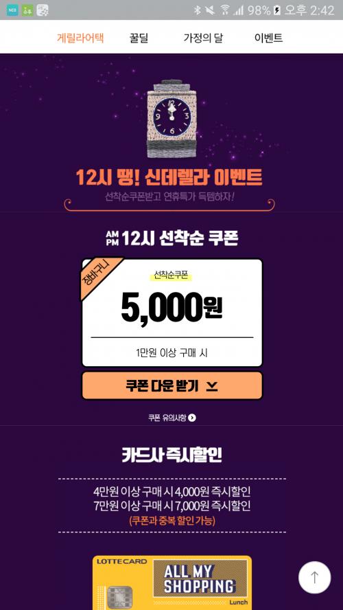 황금 특가에서 게릴라어택으로 바뀌고 쿠폰은 살아 있네요. 네이버 서버시간 알려주는 사이트 58초에 누루면 되는거 같아요. 사람 몰리기전에 59초에 8개 받았는데 그뒤 한개도 못 받다가 58초에 누루니 발급됬네요.