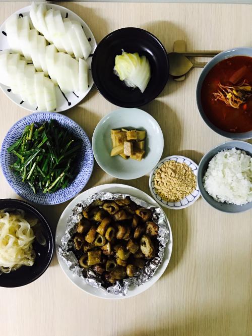 밖에서 아이랑 기다리다 급 늦게 퇴근한다는 남편 연락 받고 여섯시쯤 부랴부랴 집으로; 아이랑 둘이 먼저 먹고 있는걸로 대충 차려봅니다.