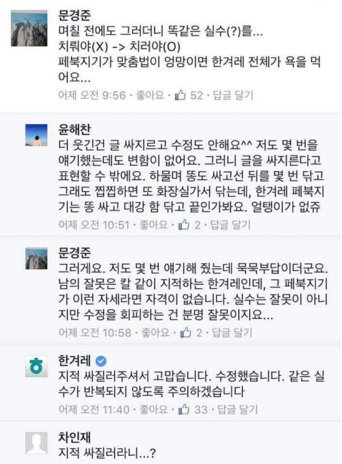맞춤법 지적하자 지적싸질러줘서 땡큐~ 이러다가 여론악화되니까