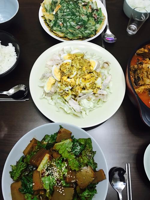 시래기도 넣은 묵은지등뼈찜 과 부추오징어전 , 도토리묵무침, 친정엄마가 샐러드 좋아하셔서 만들어본 닭가슴살 겨자샐러드 예요.