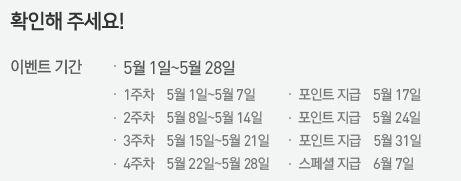 6/7일에 스페셜과 같이 들어 오는 거 아닐까요? 이전 포인트 지급도 대략 열흘 정도의 텀을 두고 들어오고 스페셜은 4주치를 마지막 지급일에 한꺼번에 들어온다는 의미로 전 봤거든요...^^ | ||