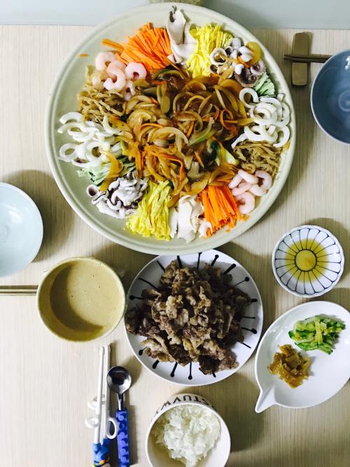 남편이 좋아하는 양장피 와 아이와 먹을 냉동실에 있던 차돌박이 해동해서 구워냈어요.