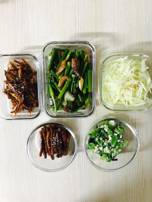 오늘의 반찬은, 고추장멸치볶음 과 건새우마늘쫑볶음, 감자볶음, 마늘쫑무침, 청경채두부버무리 예요.