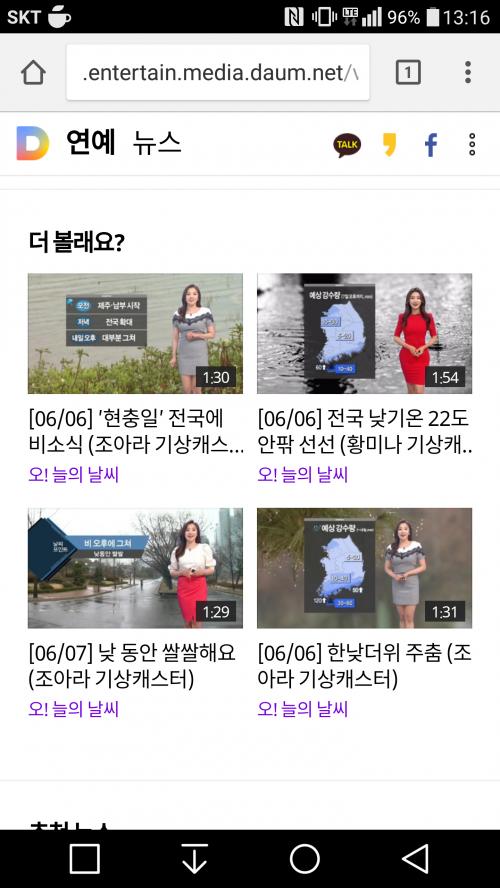 어떤 때는 기상캐스터 옷이랑 체형(?) 보다가 기상 예보는 잘 못 듣고 지나가는 경우도 있더라구요. | ||