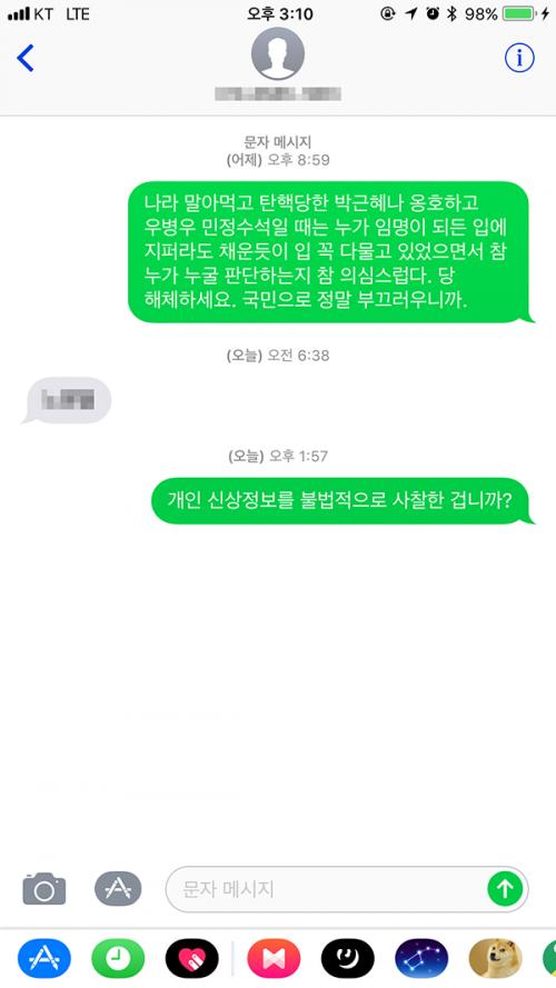 이름 말하면 쫄거라 생각하나요. 하등 문제될거 없는 문자인데. 이름만 툭 저렇게 보내면? 더 우스워 보이네요. | ||