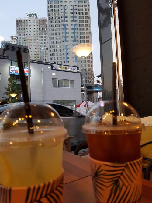 집앞에 와서 간단히 후식으로 아메와 레몬에이드 한잔 하면서 각자 폰질 중입니다.ㅎㅎ