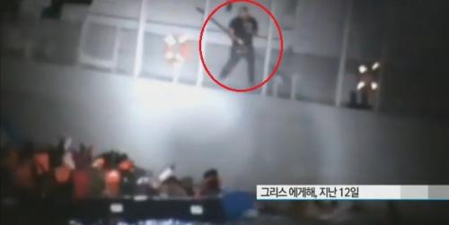 이때 그리스 경비정에서 어떤 남자가 막대기를 들고 나타남