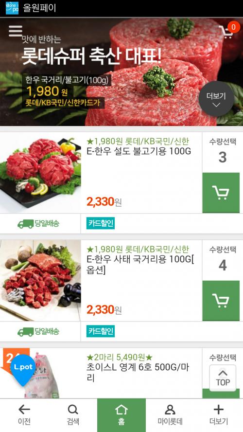한우 국거리 불고기가 100g에 1980원이네요.(일부카드)