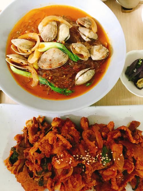멸치육수 대신 바지락 맛이 우려나도록 끓이고, 양념장 넣고 불려둔 당면 넣고 휘리릭 볶아내면 끝인 세상 간단한 음식이예요 ㅎㅎ