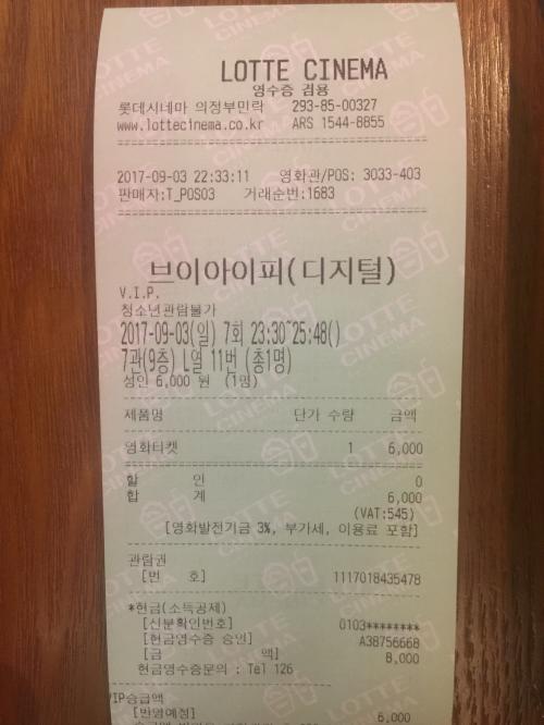 영수증 보면 신기한게 영화티켓은 6000원인데 현금영수증은 8000원으로 등록이 되네요.. 차액 2000원 뭘까요? ㅎㅎ