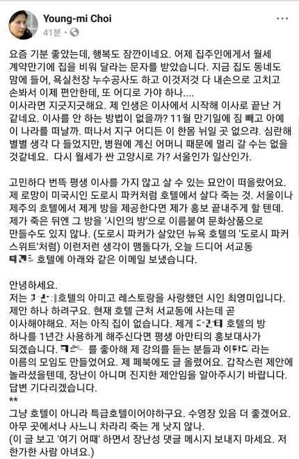 이거 해명글도 나왔어요. 호텔에서 프리로 이용할거냐, 디스카운트 받고싶은거냐 물어보니까 원래 공짜로 쓰고 싶었는데 인터넷에서 하도 뭐라해서 상징적인 액수 정도는 지불하려고 했다함. 덧붙이면서 원래 호텔에서 시낭송이라도 하려고 했다. 그 정도면 값은 충분히 치르는거니 무료로 쓰는 것도 아니다. | ||